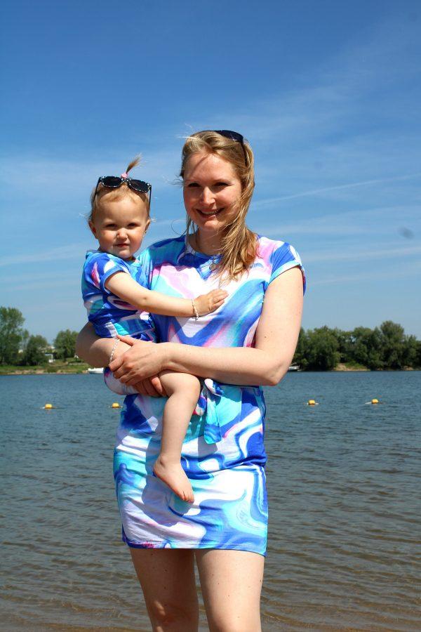 Tolle Kleider einzigartig bei BabesundBinkies! Kleid(e) für Mutter & Tochter, wie toll, das gleiche trendige Kleid zusammen zu tragen 🙂 Weil Twinning gewinnt! Die Kleider haben einzigartige Drucke und sind von Größe 86 bis XXL erhältlich. Die Kleider sind aus Viskose für optimalen Tragekomfort und haben eine Schleife um die Taille und superschöne Seitentaschen. Dieses Kleid hat ein wunderschönes blau-rosa Design.